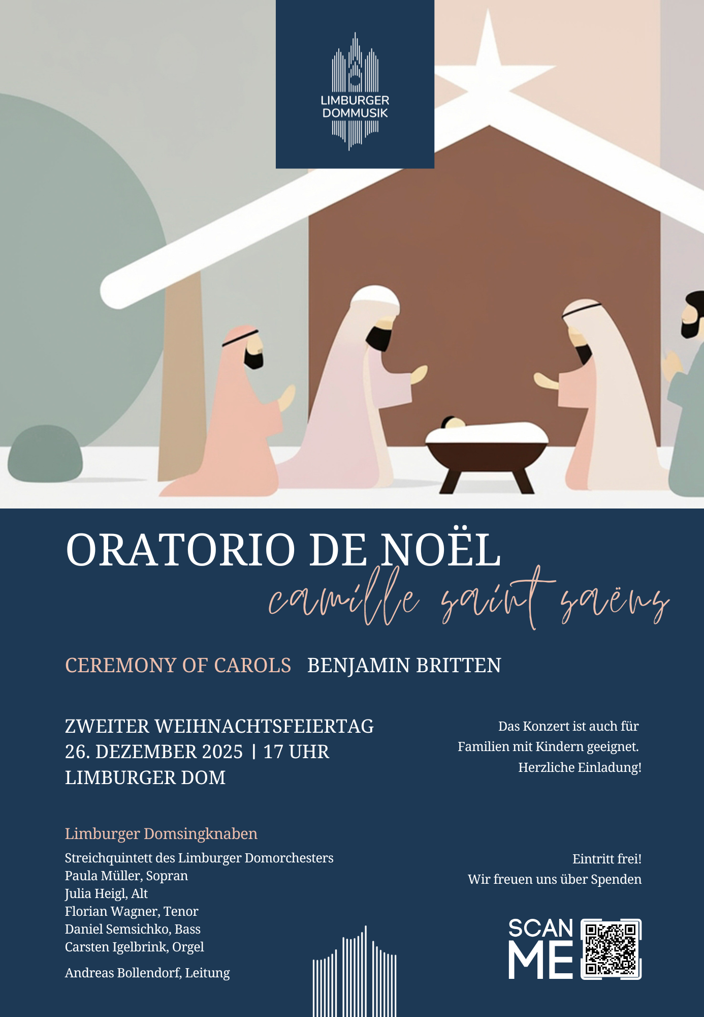 ZWEITER WEIHNACHTSFEIERTAG 26. DEZEMBER 2025 17 UHR LIMBURGER DOM ORATORIO DE NOËL camille saint saëns Eintritt frei! Wir freuen uns über Spenden CEREMONY OF CAROLS BENJAMIN BRITTEN Das Konzert ist au